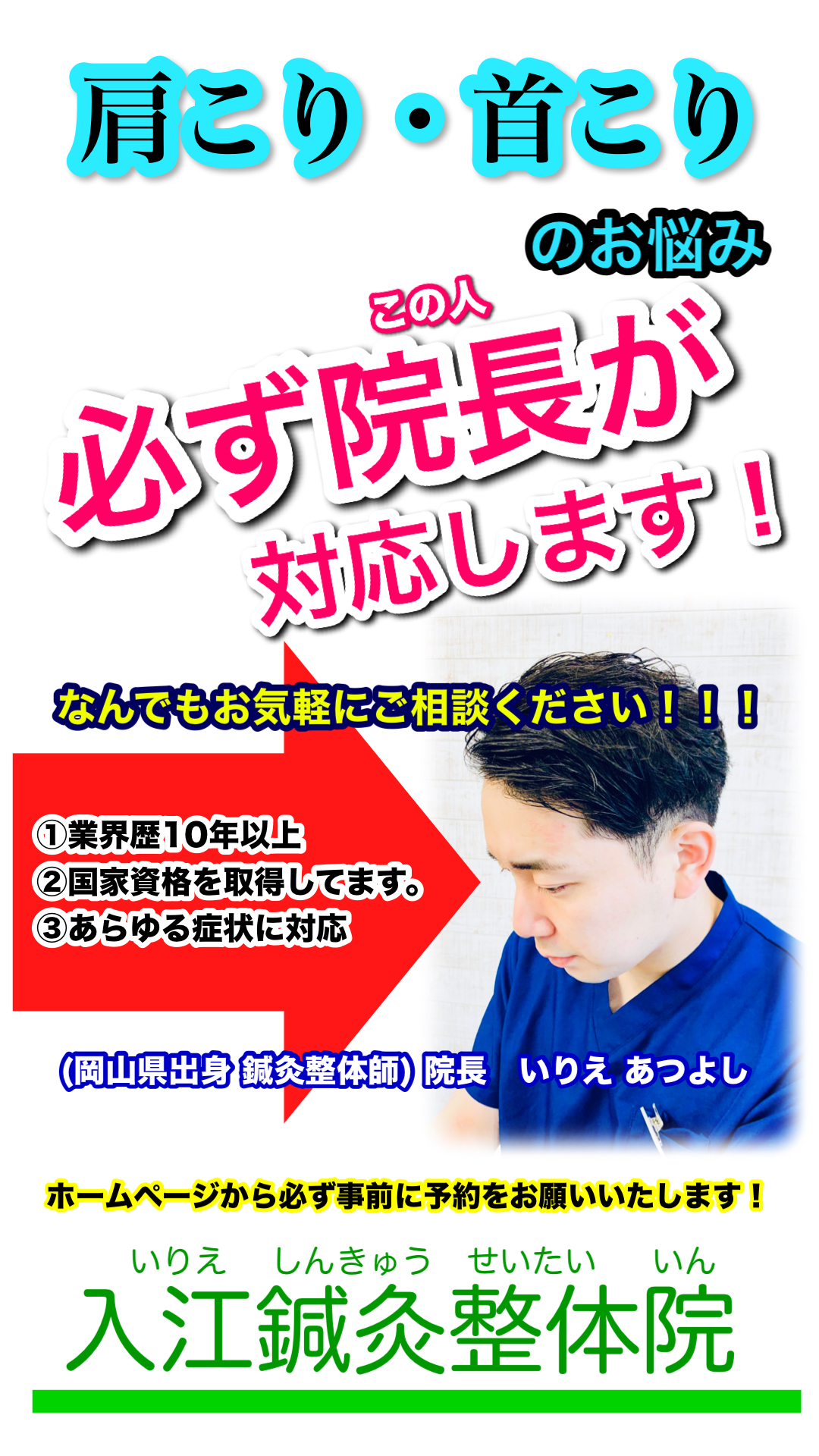 ご予約は必ず下記リンクの入江鍼灸整体院ホームページから事前にお願いいたします。